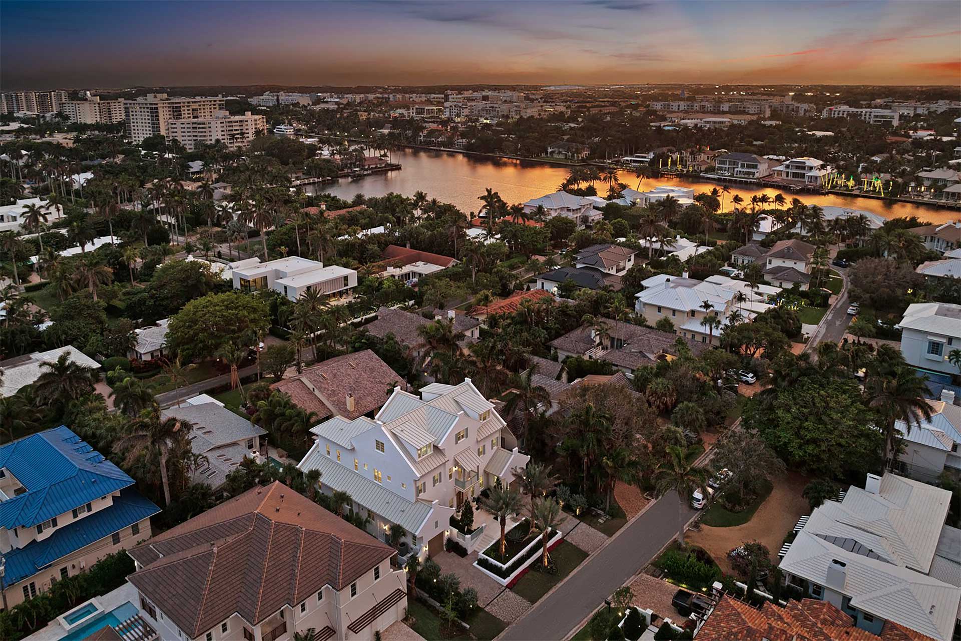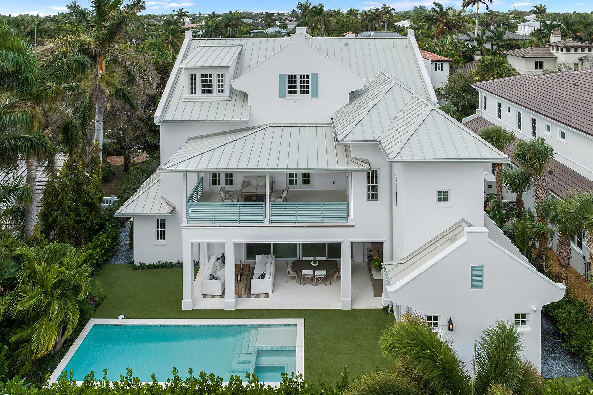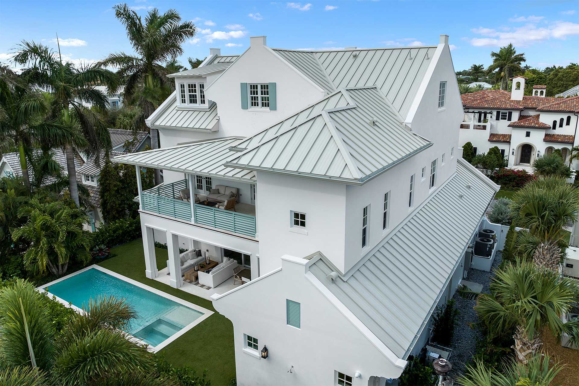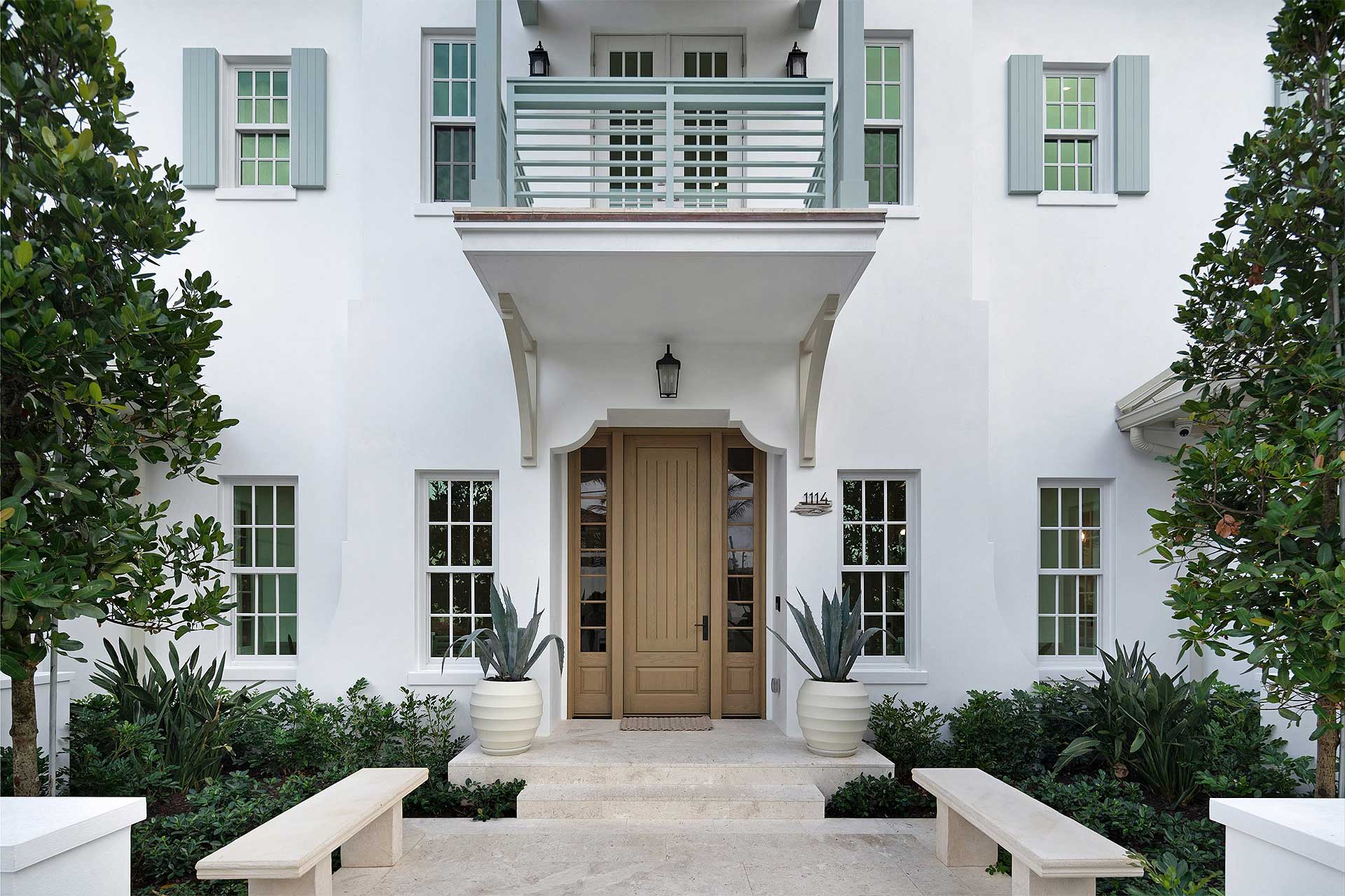 This coastal home takes influence from Alys Beach architecture, blending Bermudan and Antigua, Guatemala influences. Featuring white stucco faces, stepped roofs and private courtyards, this house sits just a short distance from both the Intracoastal and the ocean, offering a breathtaking vantage point for enjoying the sunrise and sunset over the water. The roof, shutters, and railings feature soft pastel hues, evoking a Bermudan-Antigua inspired charm that accentuates the coastal aesthetic. Inside, light wood offsets the light-colored interiors.