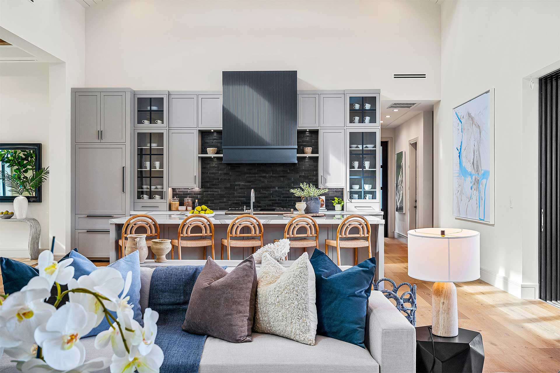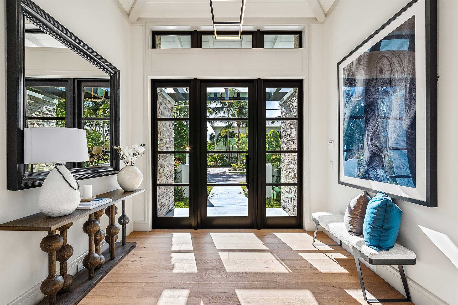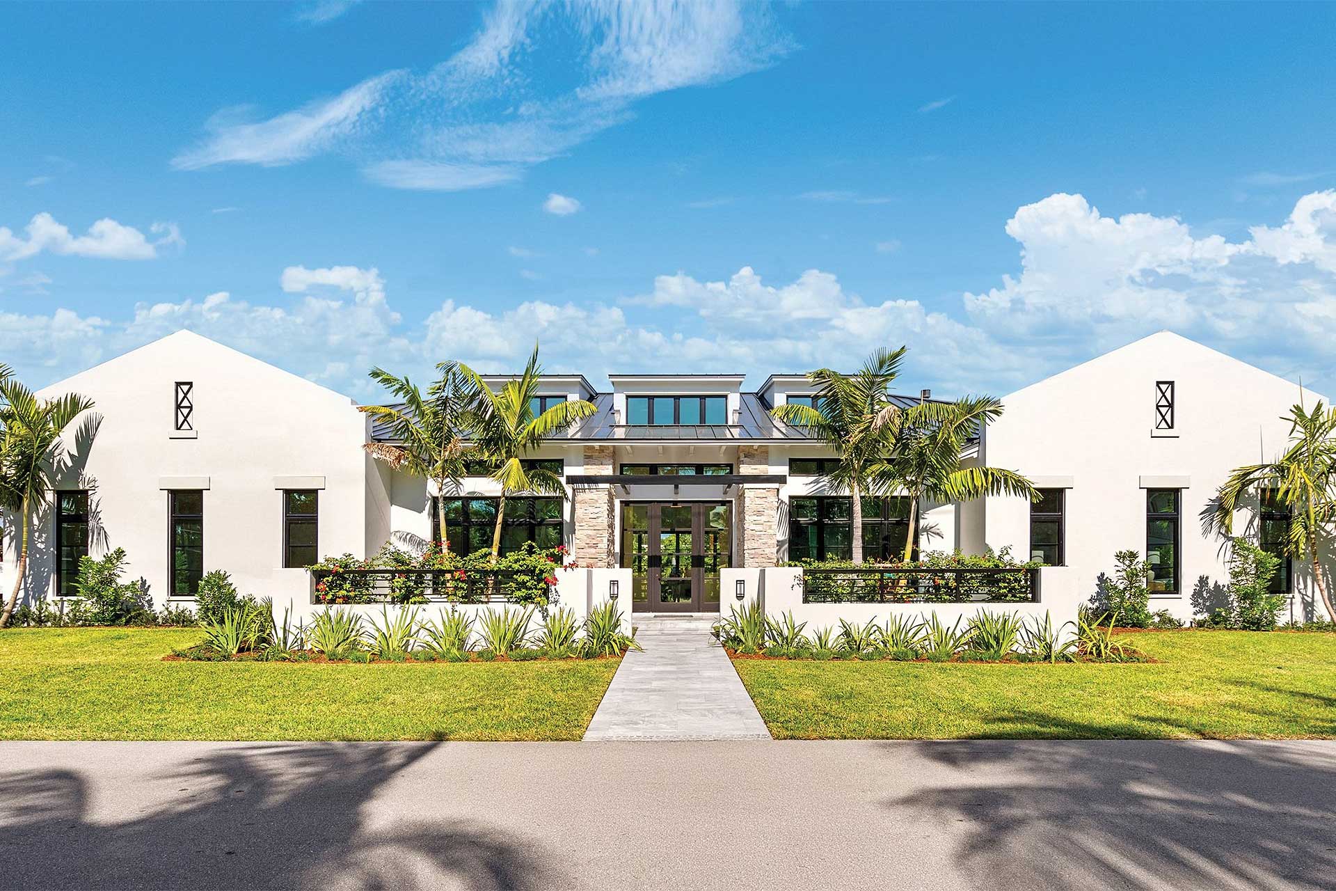 This contemporary farmhouse features large windows positioned to harmonize the interior with exterior spaces, enabling natural cooling through cross-ventilation. The symmetry of this house directs the eye along a central axis, seamlessly guiding the view from the front façade to the rear. Exposed trusses accentuate high ceilings creating a fluid transition from space to space while optimizing the sense of openness along with dormers to allow more light in. Bright white exterior walls create a pristine backdrop, allowing the dark bronze details to shine, giving the home an elegant island feeling.