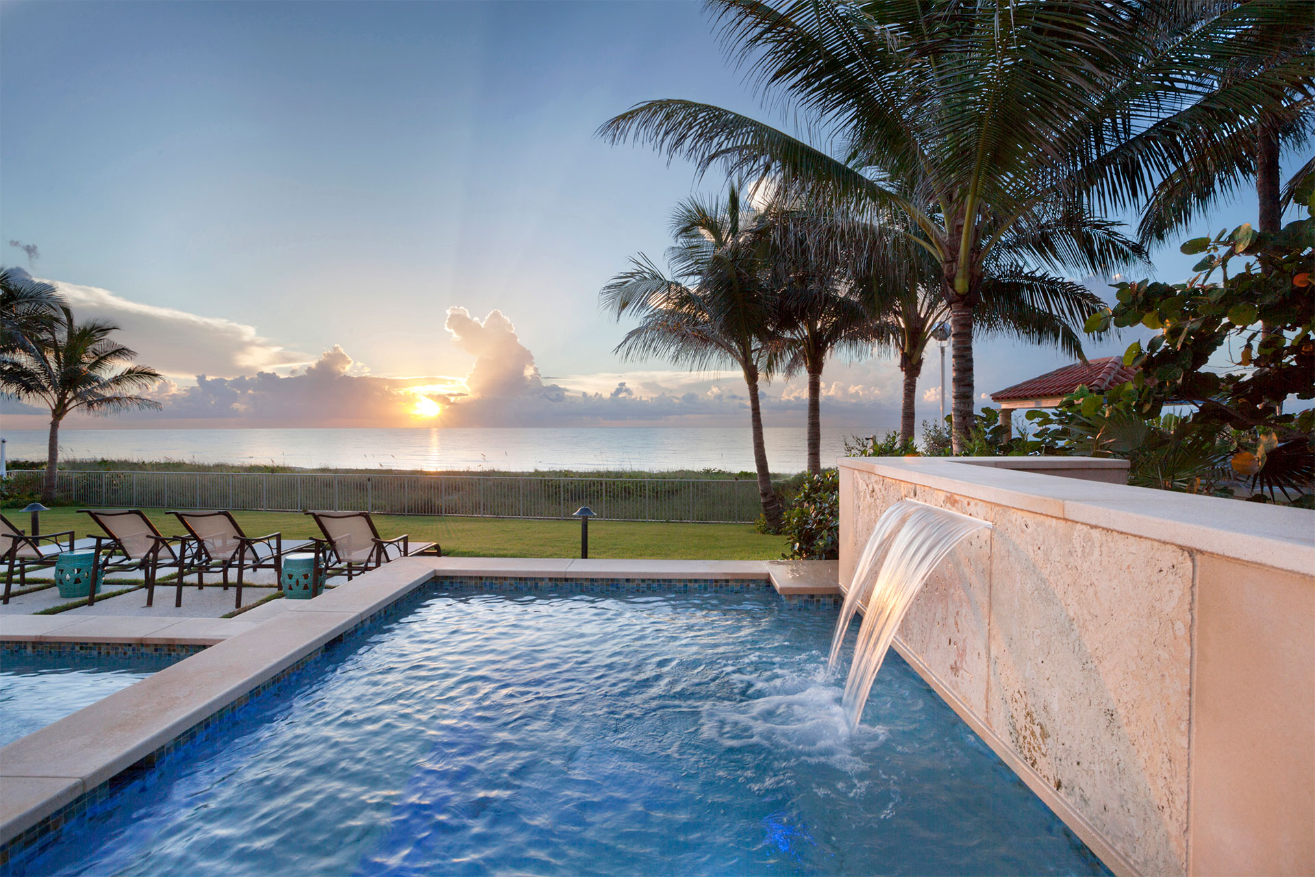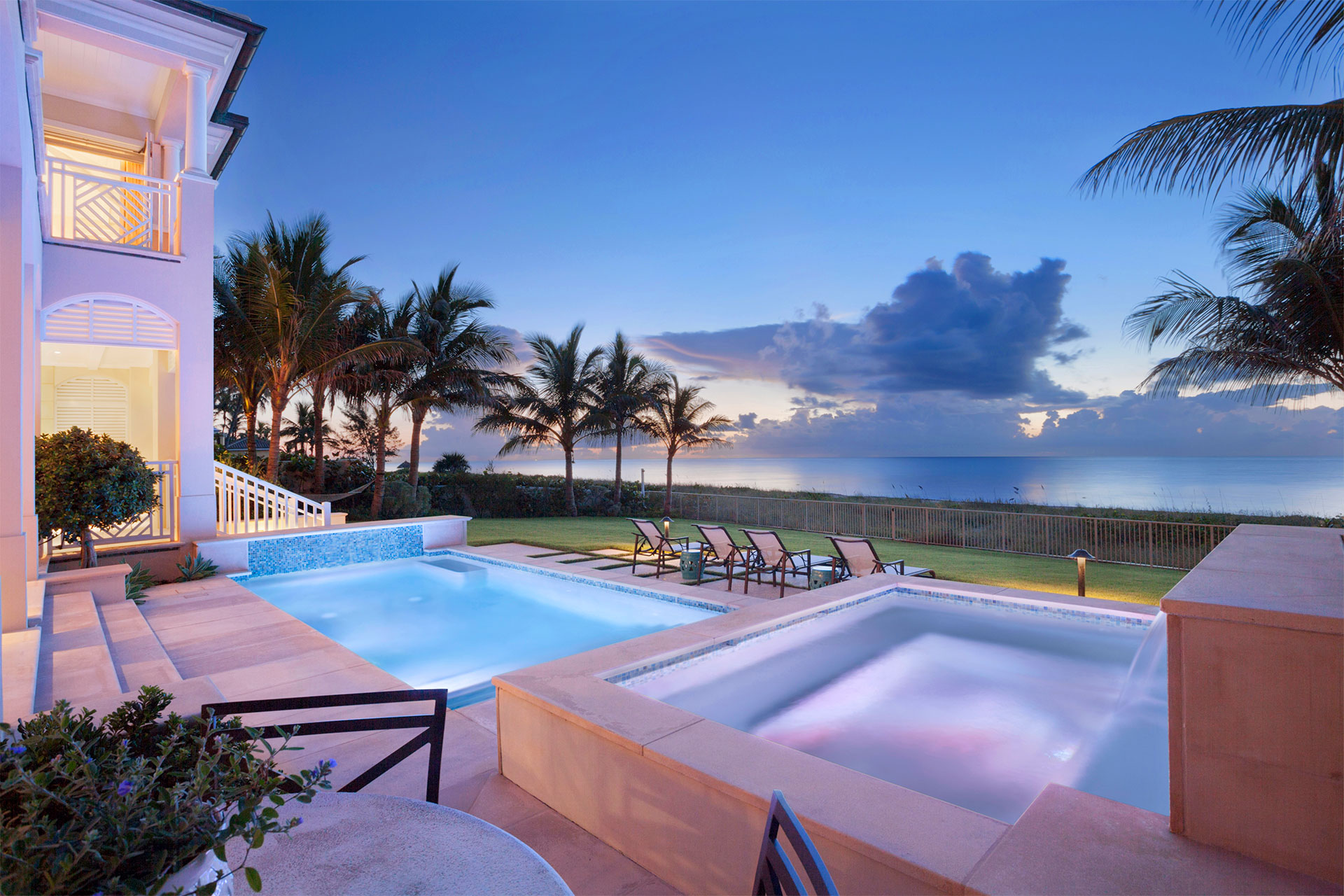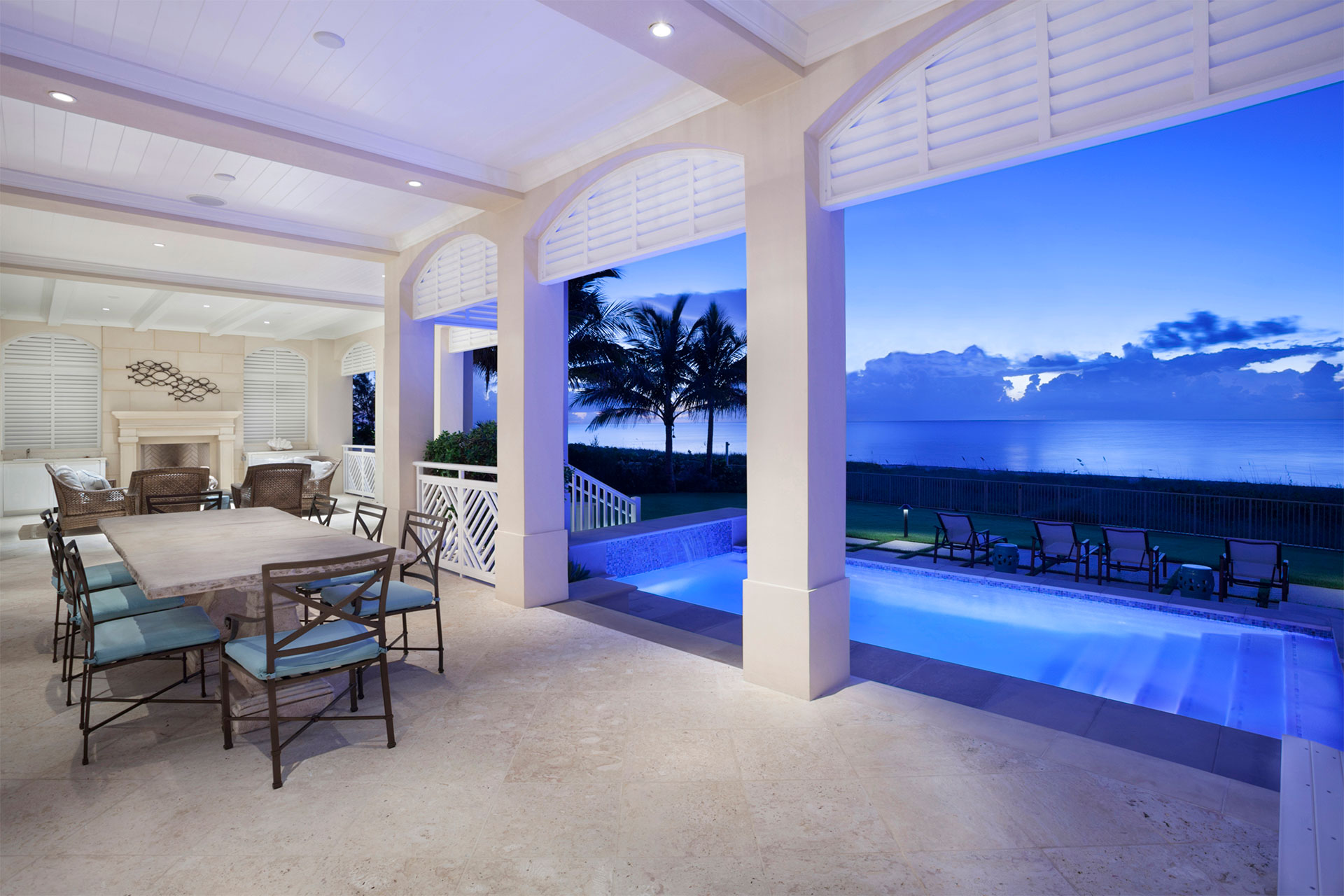 This coastal Bermuda inspired home sits directly on the beach, boasting classic architecture with covered porches and French doors and features a gym, underground parking garage for six vehicles, wine cellar and guest cottage. This home is oriented for maximum cross-ventilation, encouraging breezes to flow freely through the home from east to west, cooling the interior spaces.
